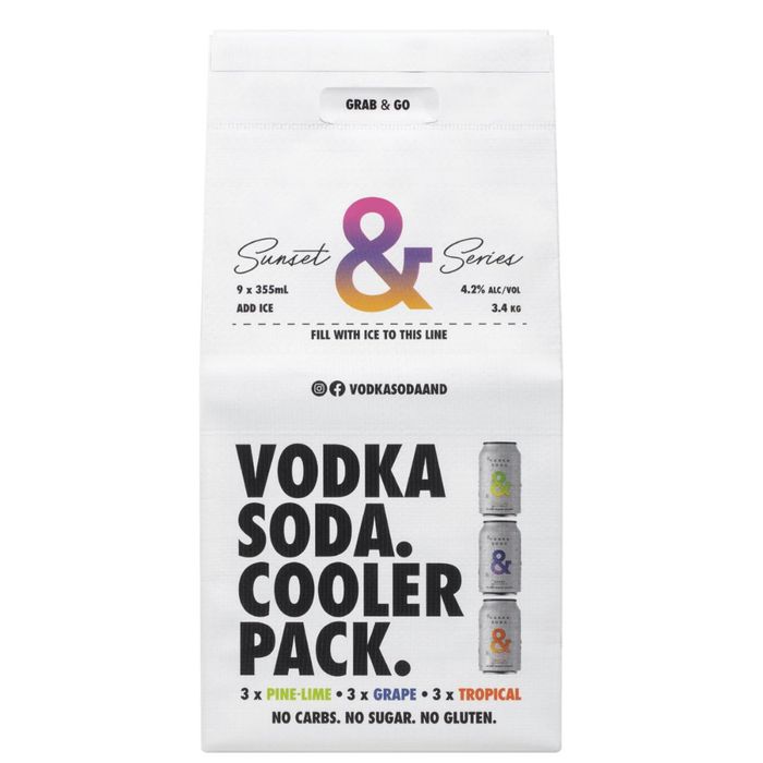 Vodka Soda Sunset Series Cooler Pack Limited Edition Just add ice! Summer sorted! Pack contains: 3 x Pine Lime 3 x Raspberry 3 x Passionfruit (9 x 355ml cans, 4.2% alc/vol)